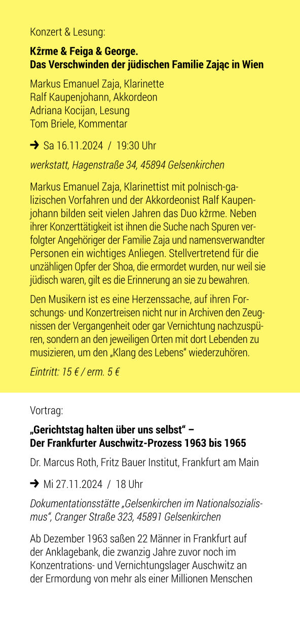 | Unsere Publikation feiga & george. das verschwinden der jüdischen familie zając in wien wurde bereits auf der Plattform info-netz-musik (http://info-netz-musik.bplaced.net) vorgestellt und wird im März nun in der online-Fachzeitschrift „Forum Musikbibliothek“, Jahrgang 45. Heft 1 / März 2024 erneut erscheinen. Hier ein die Musik betreffender Auszug: „Die Musik auf der Doppel-CD zum Buch entstand ebenfalls während der Wienreise. Es ist improvisierte Musik, wie man sie in dieser Besetzung auf diesem Niveau selten zu hören bekommt. Kaum mag man glauben, dass es keine notierten Vorlagen gibt, so perfekt funktioniert das Wechsel- und Zusammenspiel von Klarinette und Akkordeon, bis in subtilste Klänge hinein. Die Musik, die sich einer eindeutigen Zuordnung zu Genres wie Neue Musik, Jazz oder Klezmer entzieht, changiert zwischen Schwermut und Lebensbejahung, Trauer und Hoffnung, Vergeblichkeit und Aufbruch, immer wieder bricht sich jedoch ein dunkler Unterton Bahn. Es ist Musik, die unter die Haut geht, wenn man sich auf sie einlässt. In einigen Stücken wird das Duo kẑrme durch Wiener Musiker verstärkt. Mit ungeheurer Präzision, geradezu unerbittlich, doch nie sich aufdrängend, spielt Titus Vadon die Rhythmus-Schläge. Johannes Groysbeck sorgt in dem Stück „Wien Westbahnhof“ mit seinem selbsterfundenen Instrument, dem Groysophon, einer Art Elektrozither, für eine besondere Klangfarbe und Wirkung. Die Doppel-CD stand – wie auch schon die beiden Vorgänger-CDs von kẑrme aus den Jahren 2014 und 2016 (6032 32513 / pierogi, schabbes und das schwarze gold) – auf der Longlist des Preises der Deutschen Schallplattenkritik (2/2023, Kategorie „Grenzgänge“).“ Der vollständige Artikel: |